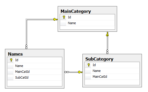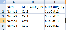 Pretty much standard stuff and very simple one too, you have a Names table which contains a set of names associated with some main categories and some sub categories. Main and Sub Categories are in their own tables with SubCategory having many-to-one relation with MainCategory. Updating this kinda multi-relation table structure can be complex compared to inserting into just one atomic table. Now lets look at the Excel file structure: