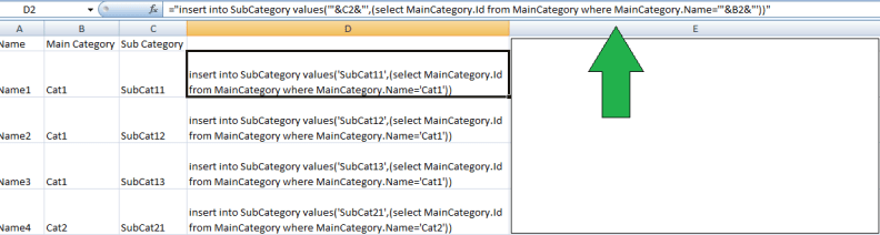 I have made some assumptions here, for e.g. the names in the MainCategory and SubCategory are unique, afterall whats the point of having 2 main categories with same name, right? You may have 2 sub categories with same names, but as we will see that might cause conflicts. To start with generating SQL, I will first populate the Main Category table as it does not have any refrential dependency on any other table. So I copy column B onto a new sheet, remove all syntactic duplicates using Data -> RemoveDuplicates in the Excel tool bar and then I would actually write inline statements on the formula bar like so: