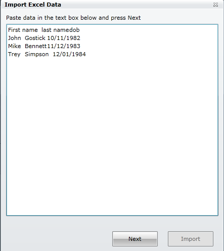 The way this control works is, copy the excel data and paste into the text area as shown below, click “Next” and map the values in drop downs to the columns your client code expects and click “Import” to spit out the flat column value collection: