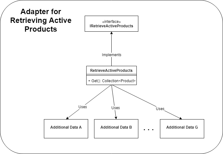 One of the key insights of this style of architecture is that the ports and by definition the adapters are for carrying out a specific domain function and they are never about the technology itself. So the fact that we needed to execute these half a dozen queries to get all sorts of additional data in order to eventually calculate reorder level, is an internal detail of a much coarser operation i.e. get active products. So why not encapsulate all that complexity behind a single port i.e. interface? Think the Facade design pattern. So that’s what we did!