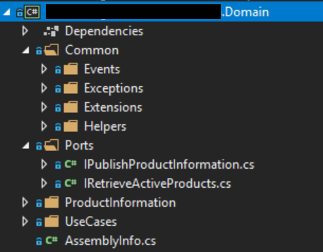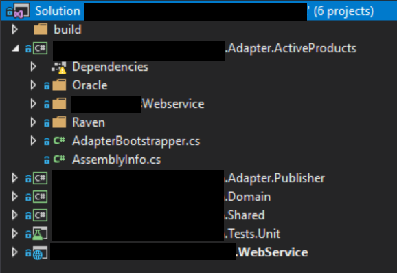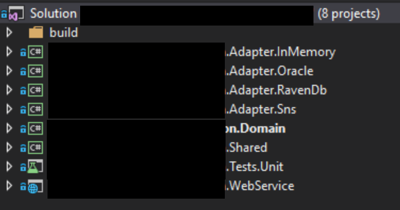 We also got rid of technology specific adapter assemblies because they can very quickly grow out of control. Its much simpler to just create technology specific folders within an adapter that’s structured by the function it serves. Although, if you have a good enough reason to have separate assemblies and can retain testability and domain function visibility, then by all means have separate assemblies. Having dozens of technology specific packages in one assembly is also bit of a problem.