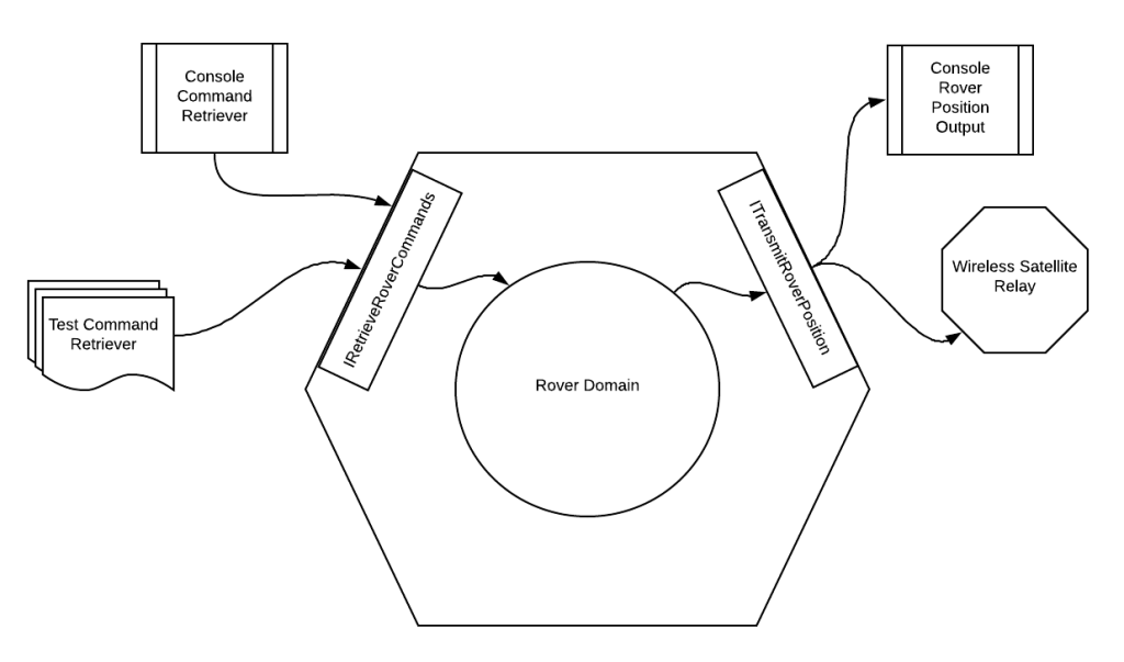 With the core domain model (and tests) out of the way, I now need to find a way orchestrate the rover and give it commands from the outside world. This is where I can bring in Ports and Adapters style, where ports are the interfaces the adapters must implement to get commands or data into and out of the core domain.