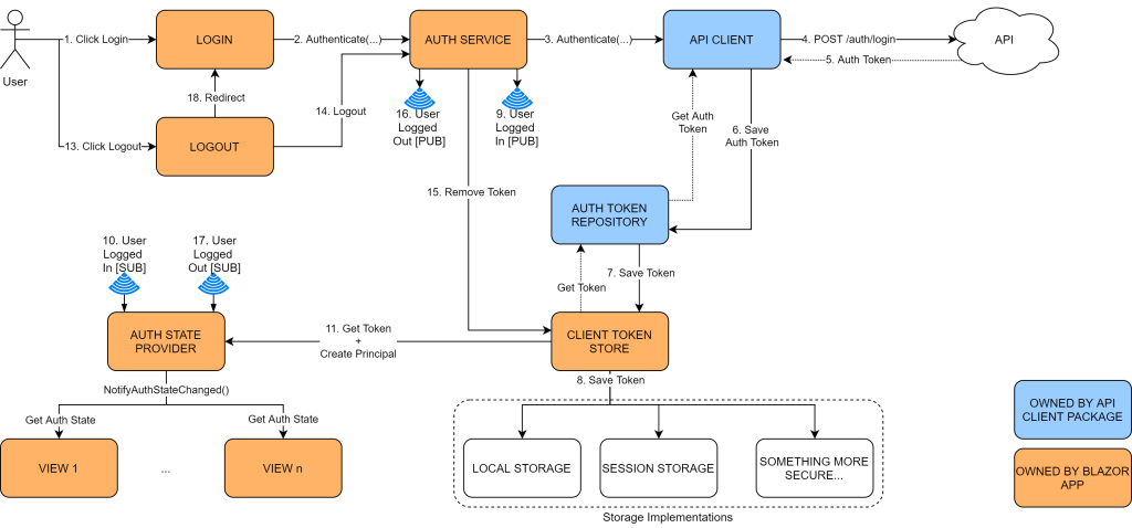 Steps 17 & 18. The AuthenticationStateProvider clears the Principal and notifies the views of the state change. The user is then navigated back to the login page.