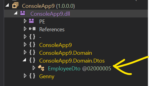 2) the project reference doesn’t reference the output assembly and also sets the item type to Analyzer. The former will make sure that any transitive dependencies of the source generator project don’t get added as references of the console app project itself (this attribute is not needed when adding a PackageReference) and the latter will make it appear as an analyzer under dependencies and this is also where I can see the generated DTO.