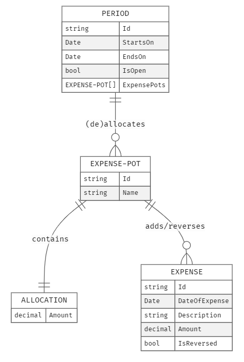 A Period can allocate one or more Pots and one or more Expenses can be added or reversed against each Pot. Period is at the root of this aggregate, meaning, any and all changes to the state of any and all constituent entities can only be made via the aggregate root. As an example: