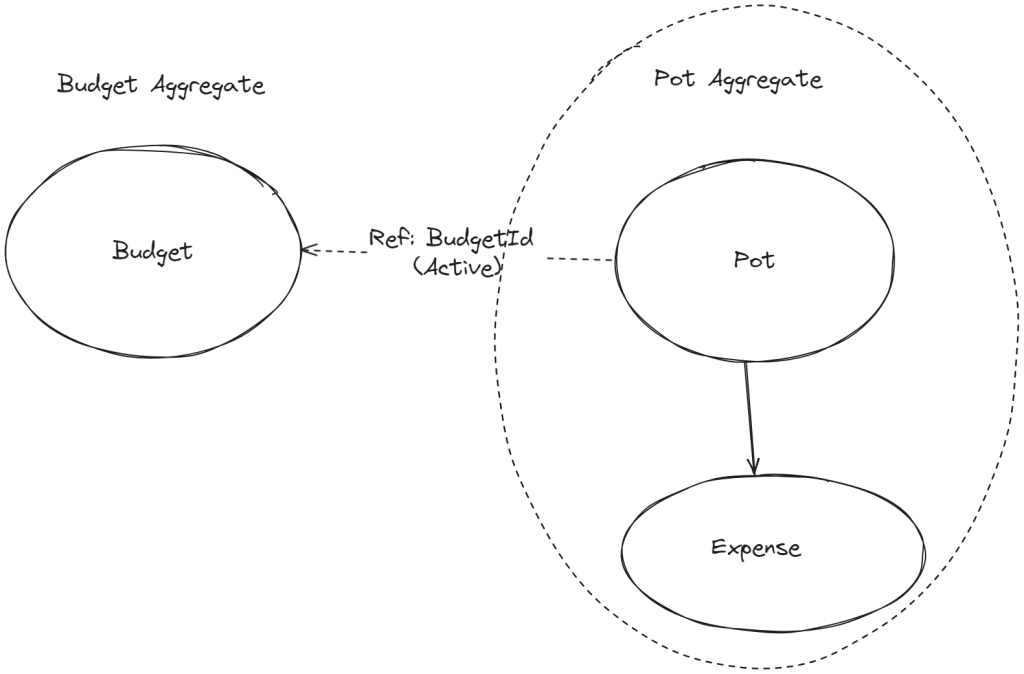 This model is similar but gets even more complex, in order to make sure expense is recorded against the right active budget and pot, the expense aggregate needs to reference both PotId and BudgetId. In order to satisfy the deallocation invariant, Pot needs to keep a collection of ExpenseId. The same problem of leaking invariant enforcement still exists in this model, just a lot worse and also since the transactional consistency boundaries are split up, both these aggregates can fail independently which could introduce data consistency issues where there were none.