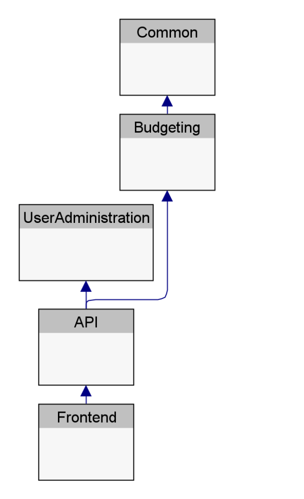 Ok, API and Frontend are not quite modules strictly speaking but they do represent entry and exit points in the system. Budgeting and User Administration modules map to the bounded contexts in the event storm. The one “missing” is Summarisation module, but for now I decided to keep it co-located within the Budgeting module, I shall pull it to the top soon.